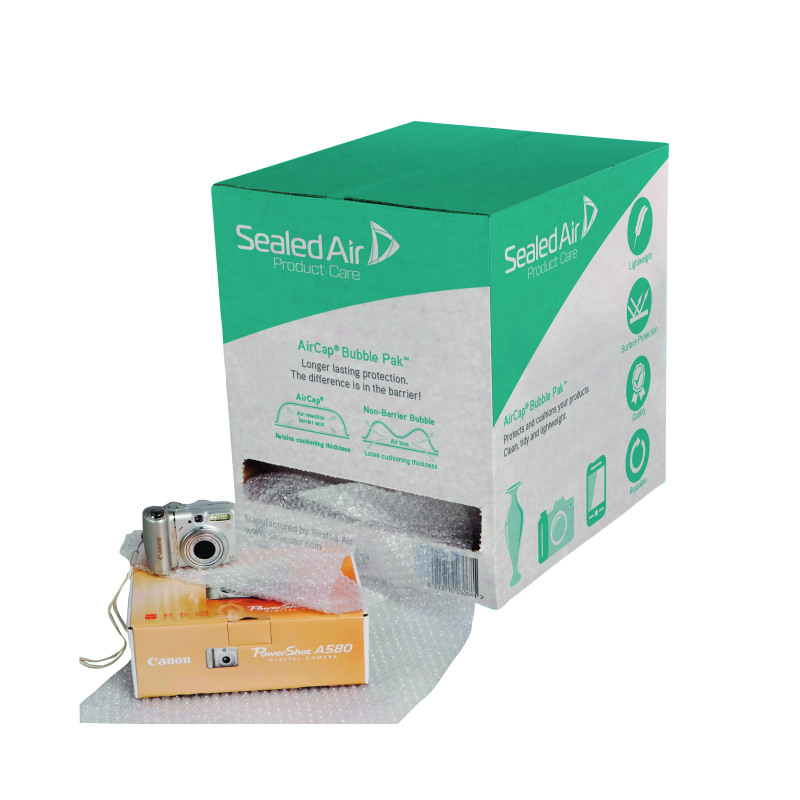Protect fragile items in transit with this Sealed Air Bubble Pak Dispenser. Bubble Pak uses barrier sealed bubbles to help absorb shock and impact, allowing you to send glass, porcelain and other breakables with confidence. Supplied in a handy dispenser and perfect for all shipping and packaging needs, the bubble film measures 300mm x 50m.