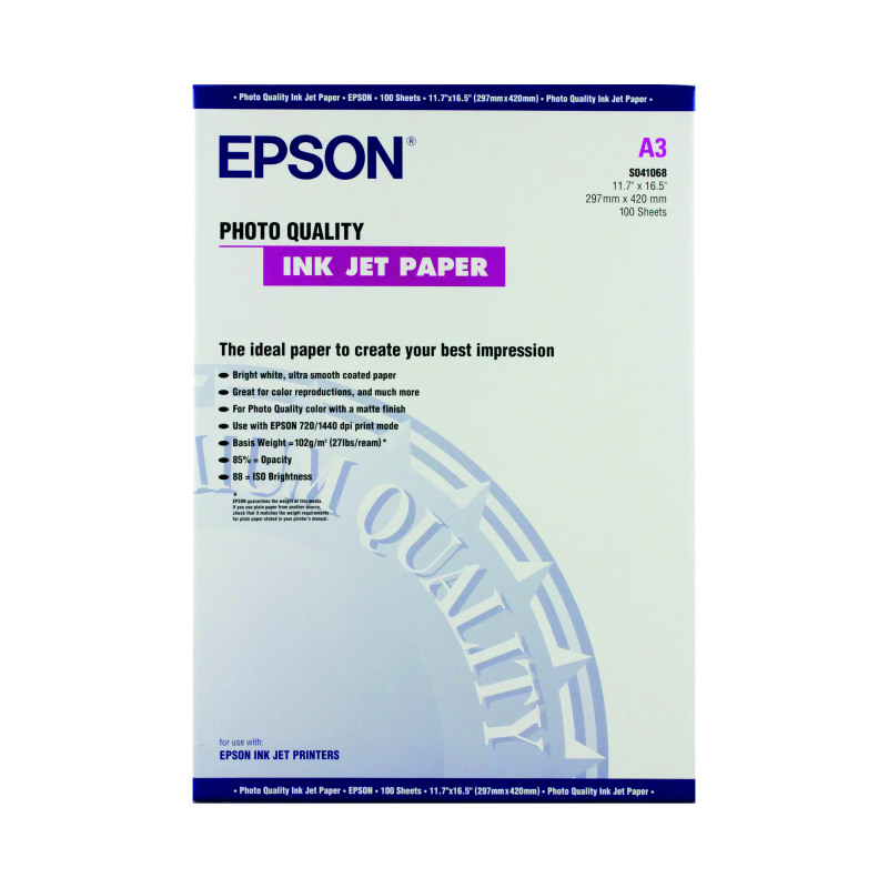Epson Photo Quality Inkjet Paper Matt 102gsm Max.1440dpi A3 Ref C13S041068 [100 Sheets]